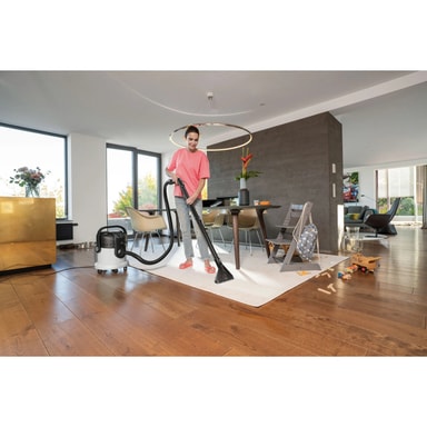 Djup rengöringseffekt kombinerat med ergonomisk design och multifunktionalitet: matt- och textiltvätten SE 4 säkerställer en hygienisk rengöring ända ner i fibrerna på många textila ytor.