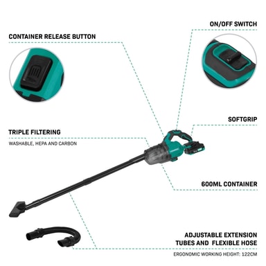 Denna skaftdammsugare levereras som ett komplett set med två 2.0Ah-batterier och snabbladdare.