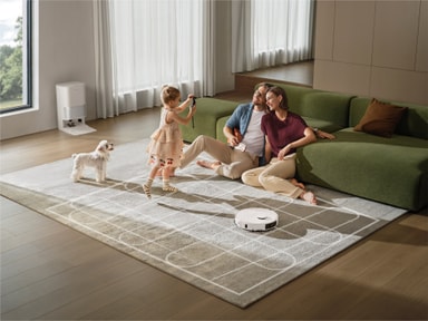 Anti-trassel-teknik hanterar långt hår och pälsdjurshår effektivt. Kantstädning riktar sig mot hörn och golvlister, medan mattförstärkning automatiskt ökar sugkraften när mattor detekteras.