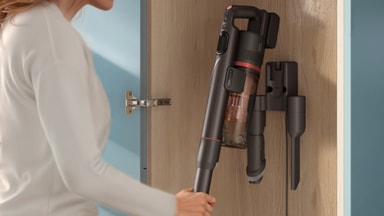 Philips sladdlösa dammsugare VC 7000 Series Aqua har en elegant, välbalanserad sladdlös design som är lätt att manövrera runt möbler och i trånga utrymmen. En digital display håller dig informerad under rengöringen, medan väggfästet snyggt förvarar och laddar dammsugaren med tillbehör alltid inom räckhåll.