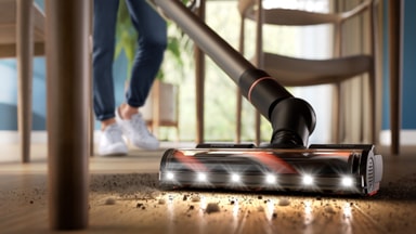 TriActive Smart LED-munstycket anpassar sugkraften automatiskt baserat på golvtyp. Inbyggda LED-lampor belyser dold smuts, vilket gör att dammsugaren kan fånga upp mer smuts i ett enda svep.