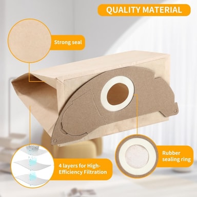 Överlägsen filtrering av fina partiklar: Upplev förbättrad rengöringsprestanda med dessa pappersdammsugarpåsar, designade för att effektivt fånga upp fina partiklar och allergener. Det högkvalitativa pappersmaterialet säkerställer optimal filtrering, vilket förhindrar att damm och skräp återcirkuleras i din hemmiljö. Perfekt för hushåll med allergiker eller de som söker en djupare rengöring, dessa påsar bidrar till förbättrad luftkvalitet och en hälsosammare livsmiljö. Regelbunden byte av dessa påsar kommer att bibehålla sugkraften i din dammsugare och förlänga dess livslängd. Dessa påsar är kompatibla med Kärcher WD2 Premium, MV2, WD 2.200 till WD 2.550-serien dammsugare.