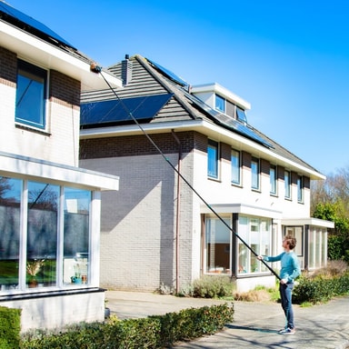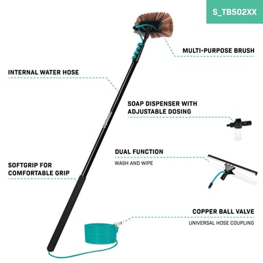Med denna teleskopiska tvättborste från VONROC kan du nå höga höjder. Denna stora modell, med en total längd på 6,50 meter, är inga områden utom räckhåll. Skrubba, polera och rengör ditt hem från topp till botten! Förutom att rengöra ditt hem är denna teleskopiska tvättborste även perfekt för att tvätta (stora) fordon som lastbilar, husbilar, husvagnar och skåpbilar. Tvättborsten levereras komplett med borsthuvud, fönsterputsare, vattenslang och tvåldispenser.
