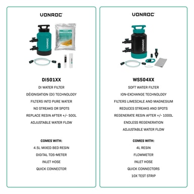 Med VONROCs innovativa, portabla vattenavhärdare kan du rengöra med kalkfritt vatten. Oavsett om du tvättar dina fönster, bil eller solpaneler, minimerar denna unika vattenavhärdare kalkavlagringar. Dess ION-utbytes-teknik filtrerar bort kalcium och magnesium ur vattnet och håller dina ytor rena och fläckfria. Vattenavhärdaren är enkel att regenerera med bordssalt, vilket gör den perfekt för långvarig och frekvent användning. Vi har exklusivt utvecklat denna vattenavhärdare, så den är unik på marknaden!
