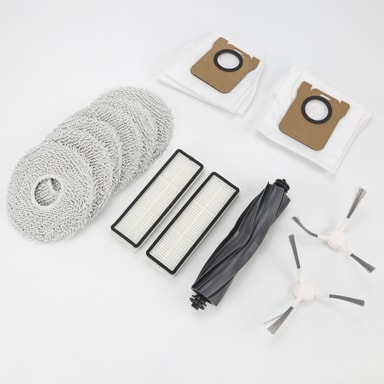 Tillbehörssats för Dreame L10s / L10 Ultra robotdammsugare, innehållande gummiborste, sidoborstar, dammsugarfilter, moppdukar och dammsugarpåsar.