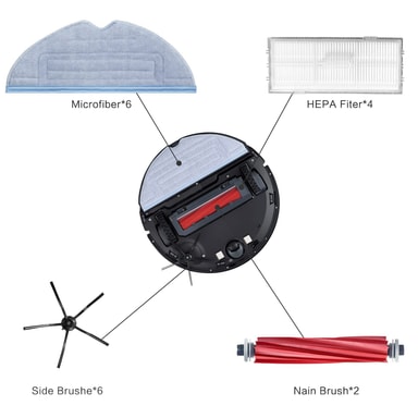 Tillbehörssats för Xiaomi Roborock robotdammsugare, innehållande gummiborstar, sidoborstar, dammsugarfilter, moppdukar, skruvmejsel och rengöringsborste.