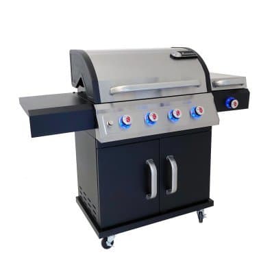 Högeffektiv infragrill på ena sidobordet. Varmhållningsgallret är stort och med detta, grillgallren och sidogrillen ryms mycket mat.