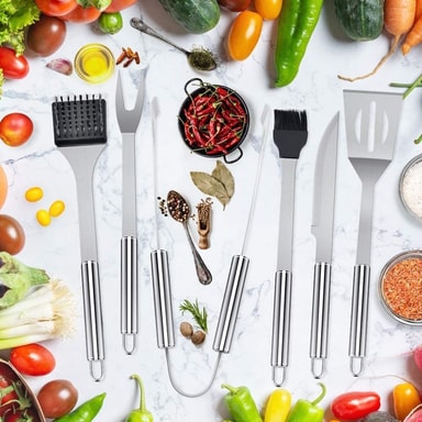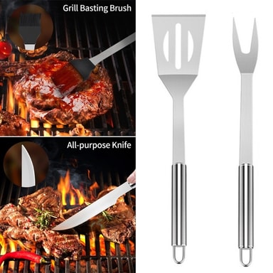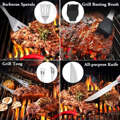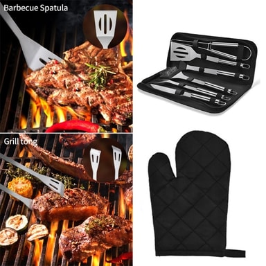 Detta grillset innehåller alla verktyg du behöver, såsom tång, gaffel, universalkniv, spatel, grillborste, rengöringsborste, isolerande handskar, bärväska