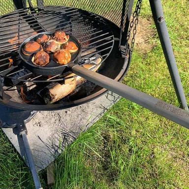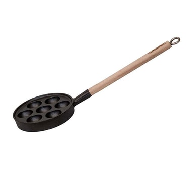 Munkjärn Gropa i solid gjutjärn är perfekt för att grädda sju munkar åt gången över bålpanna eller öppen eld. Gjutjärnet håller värmen länge och ger jämn gräddning för ett perfekt resultat. Det extra långa handtaget gör det säkert och enkelt att hantera vid elden. Ett idealiskt tillbehör för utomhusbakning!