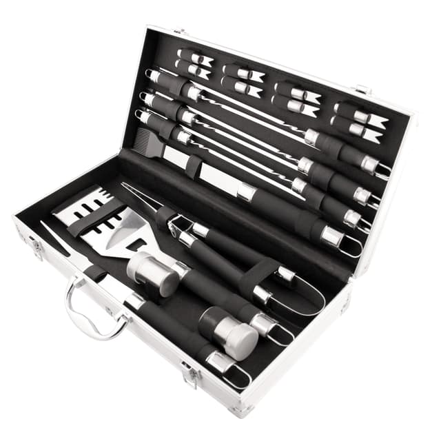 Nordic Season grillset EGT211716 innehåller 20 delar som kommer hjälpa dig när du ska grilla. Delarna är tillverkade av rostfritt stål och förvaras i den medföljande aluminiumväskan när du inte använder dem.