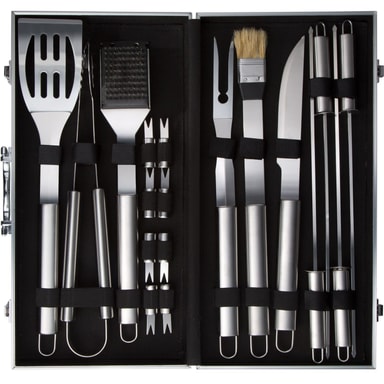 Våra grillbestick av rostfritt stål är de optimala redskapen vid grillning. Allt du behöver från förberedning, stekning och skärning till rengöring och förvaring finns i detta grillset. Den praktiska och eleganta aluminiumväskan med invändigt svart sammetsfodral är dessutom den perfekta förvaringen för dina högkvalitativa grillbestick och är alltid nära till hands hemma eller på resan. Så gör du grillningen till ett nöje! Grillbesticken är extra långa, så att du alltid kan arbeta på tillräckligt avstånd från glöden. Köp dina nya bestick till din grill från tectake redan idag.