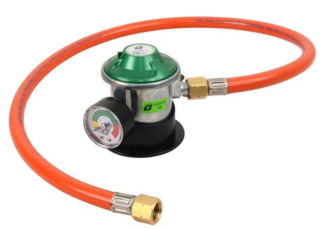 Gasregulator inklusive säkerhetsmanometer och extra lång 1,1 meter godkänd gasslang. Passar på DANSKA gasinstallationer. Regulatorn är försedd med säkerhetsmanometer. Manometern är din garant för att gasflödet är intakt. Sjunker trycket på manometern indikerar detta fel eller otätheter på installationen. Stäng omgående gastillförseln och demontera regulatorn från gasolflaskan. Gasslangen och regulatorn bör kontrolleras regelbundet. Gasslangar blir spröda med tiden och vid eventuella sprickor och liknande bör slangen bytas omgående.