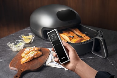 Typhur Sync One stektermometer WT01 är trådlös med 6 sensorer, ±0,3 °C noggrannhet, 0,5 sekunders svarstid och Bluetooth/Wi-Fi-anslutning. Den tål 400 °C värme och är vattentät. Den ansluts till Typhur-appen för enkel styrning.Läs mer om produkten