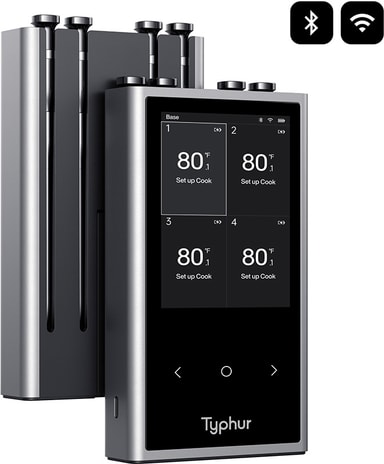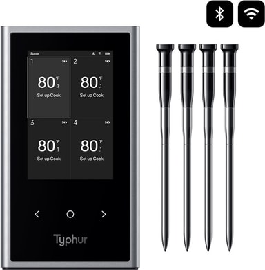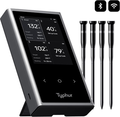 Typhur Sync Quad stektermometer WT08 levereras med 4 givare som var och en har 6 sensorer. Den har kapslingsklass IPX8 och en noggrannhet på ±0,3°C. Med Bluetooth/Wi-Fi och en realtidsbasstation ger den exakt temperaturkontroll i flera zoner.Läs mer om produkten