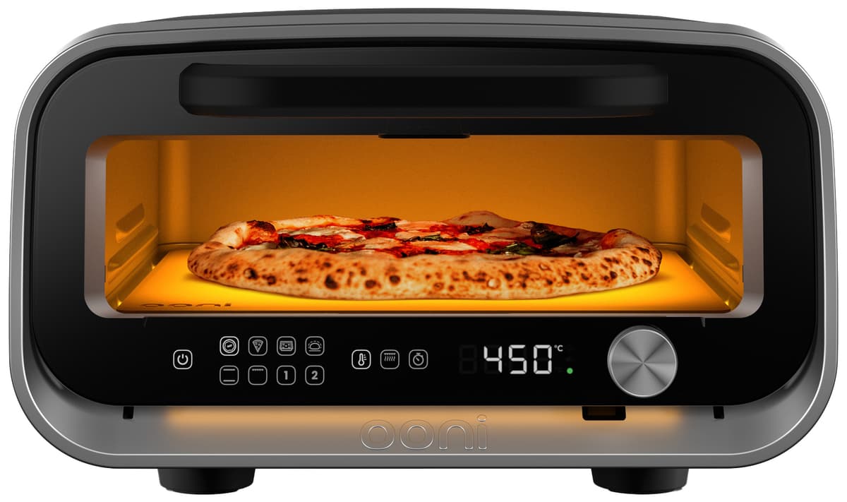 Ooni Volt 2 pizzaugn UU-P35C00 bakar 30 cm pizzor med sitt smarta Pizza Intelligence-system. Med förinställningar för olika pizzor når den 450°C och bakar äkta napolitanska pizzor på 90 sekunder.Läs mer om produkten