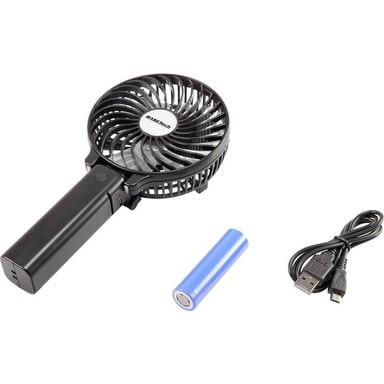 Skapar den nödvändiga kylningen under varma dagar. Den ihopfällbara fläkten med handtag kan tas med överallt. Multifunktionell design Användning av fläkten är flexibel. På så sätt kan den användas som handfläkt, men även stående eller hängande med en metallhållare på önskad plats. 3-stegs reglering De olika valbara varvtalen ger optimal ventilation. Denna handfläkt har 3 hastigheter (2,9 m/s, 3,9 m/s och 4,8 m/s) Inbyggt batteri Fläkten är laddningsbar via micro-USB. Löptiden är upp till 8 timmar. Tack vare det inbyggda litiumbatteriet och 4 watt effekt är den här fläkten betydligt kraftfullare än vanliga batteridrivna handfläktar.