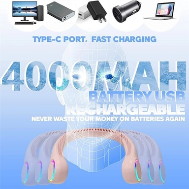 • Fläkt Bärbar nackfläkt 3 hastigheter bladlös laddningsbar handsfree LED-lampor