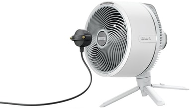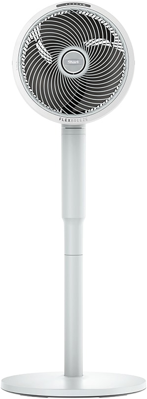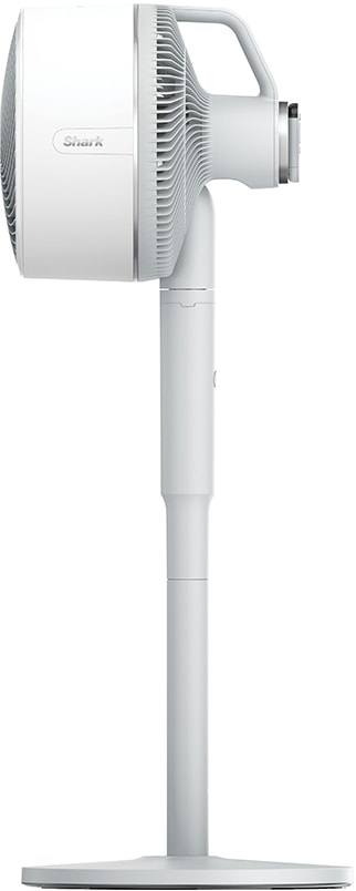 Shark FlexBreeze-fläkten har en elegant vit finish. Den väger 5,5 kg och är lätt men stabil. Höjden kan justeras för användning som golvstativ eller som kompakt bordsalternativ.