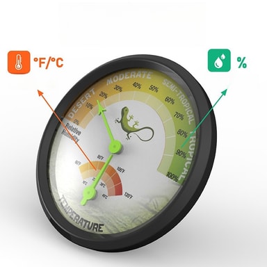 Noggrann luftfuktighetsövervakning: Denna hygrometer ger exakta luftfuktighetsavläsningar från 0 % till 100 % RF med en noggrannhet på 5 %-8 % RF, vilket säkerställer en bekväm och hälsosam miljö för din reptil.