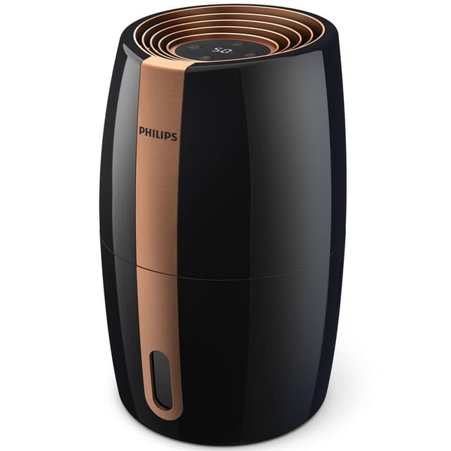 Philips Series 2000 luftfuktare HU271810 är lämplig för rum på upp till 32 m² och har ett tyst viloläge. Vattenmolekyler i nanostorlek lämnar inga vita fläckar eller våta märken. Lägena varierar mellan 40-60% luftfuktighet.