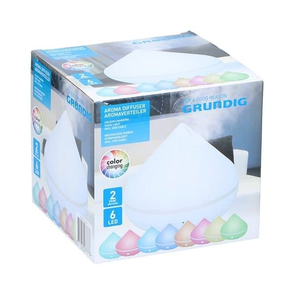 Aroma diffuser / luftfuktare förångar vatten och eteriska oljor till en väldoftande doftmist som sprider sig i rummet och skänker välbefinnande för kropp och själ. Tillsätt upp till 150 ml vatten i diffuserns vattentank tillsammans med några droppar eterisk olja så producerar luftfuktaren med hjälp av tyst ultraljudsteknik en sval och väldoftande fuktgivande dimma. Med en knapptryckning byter diffusern färg och ger rummet en avslappnad atmosfär. Levereras med USB-laddkabel. - Förbättrar andningen. - Stärker immunförsvaret. - Lindrar stress och verkar lugnande. Specifikationer Belysning: 6 x LED. Färgskiftande. Mått: 12 x 15 x 15 cm. Vikt: 0.473 kg.