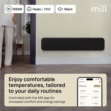Mill Invisible Smart WiFi Gen4 panelvärmaren PA1050LWIFI4BLACK är kompakt och värmer rum upp till 17 m². Värmaren har en elektronisk termostat och är säker att använda i våtutrymmen.Läs mer om produkten