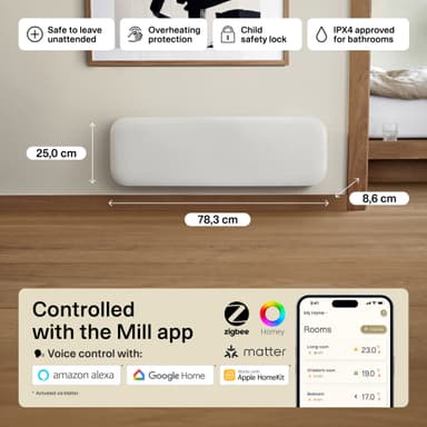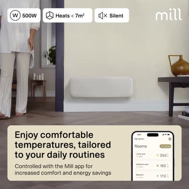 Mill Invisible Wi-Fi Gen4 panelelement PA500LWIFI4 är kompakt och värmer upp rum på upp till 7 m². Denna värmare har en elektronisk termostat och är säker att använda i våtutrymmen. För förbättrad kontroll kan den anslutas till Mill Wi-Fi-appen.Läs mer om produkten