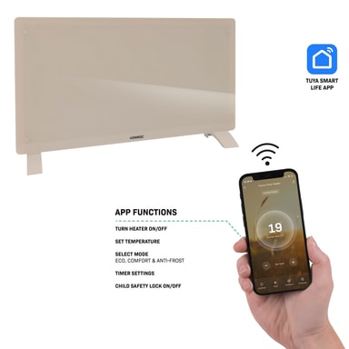 Men designen är bara början – värmaren är även fullspäckad med smart teknik. Med den kostnadsfria appen Tuya Smart Life kan du styra värmaren via din smartphone eller surfplatta, oavsett var du befinner dig. Slå på värmen redan på vägen hem – så möts du av ett varmt välkomnande!