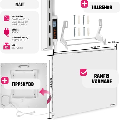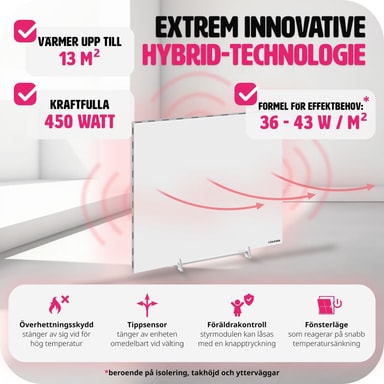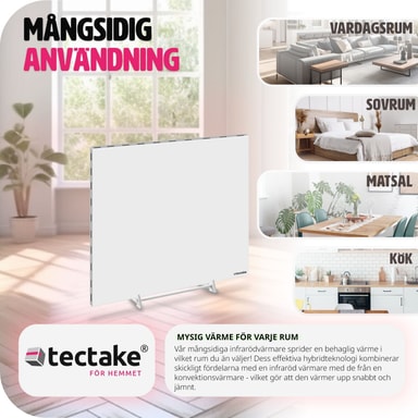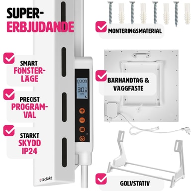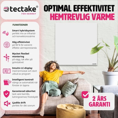 Få ut det bästa av uppvärmningen med denna moderna hybrid infravärmare med tippskydd från tectake. Få ny inspiration till mysiga stunder i ditt hem med denna terassvärmare. Förutom de olika inställningsmöjligheterna för olika tider på dygnet, så registrerar den innovativa radiatorn plötsliga temperaturfall och reagerar därefter. Den extremt platta konstruktionen på vår infravärmare, gör att den antingen kan placeras mobilt på golvet med hjälp av det medföljande stativet eller skruvas fast i väggen eller taket - upplev känslan av mild infravärme med denna kraftfulla hybrid infravärmare från tectake.