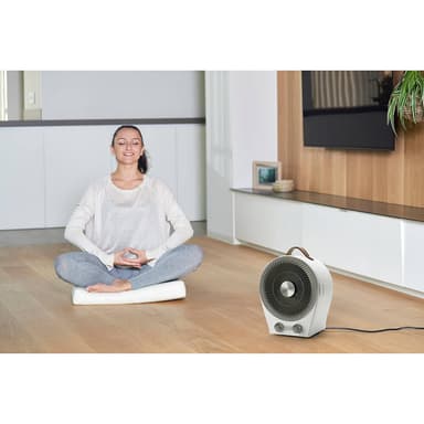 En säkerhetsbrytare stänger av värmaren om den skulle välta. Oscillationssystem säkerställer en vid vinkel på luftflödet.