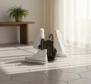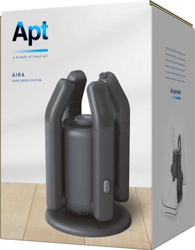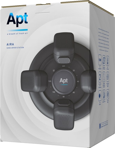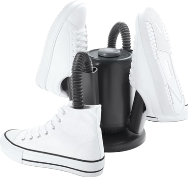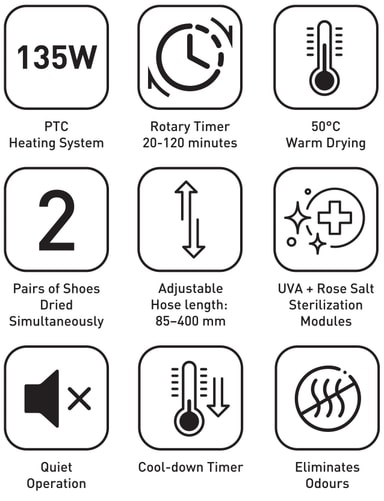 135W Apt Shoe Dryer torkar effektivt upp till två par skor samtidigt. Den har en roterande strömbrytare på ovansidan med timerinställningar, UVA-sterilisering och avger varmluft på 50°C. Den är även utrustad med justerbara dubbla slangar.Läs mer om produkten
