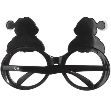 Accessoaren roliga glasögon jultomtar består av en böjbar ram med stora plastglas och rött glittrande kant. På toppen sitter jultomtar med luvor med fluffiga tofsar, material: plast.