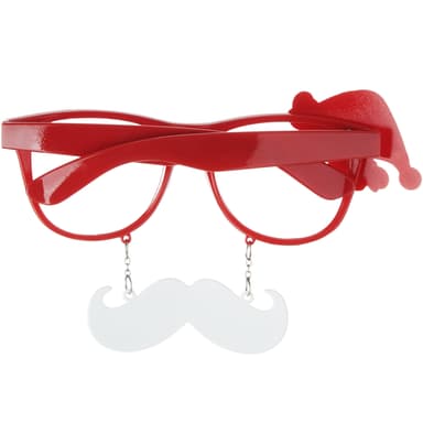 Accessoaren roliga glasögon jultomte med mustasch består av en böjbar ram utan glas. Snett på den högre övre kanten sitter en tomteluva med texten "Ho Ho Ho". Under ramen hänger en rörlig mustasch i en liten kedja, material: plast, vajer.