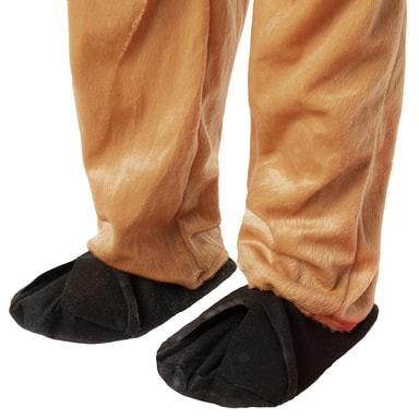 Unisex-dräkten Rasande ren i ett stycke består av en overall, en huva, handskar samt skor. Dräkten är bearbetad av ockerfärgat plyschtyg. Magen och bröstet pryds av en vit bräm av konstpäls. Overallen knäpps i ryggen med en lång dragkedja.Läs mer om produkten
