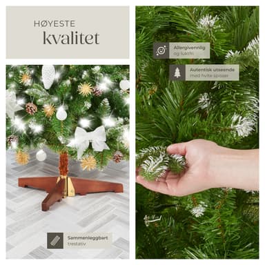 Denna konstgjorda julgran imponerar med sitt naturliga utseende och höga kvalitet. Kombinationen av PVC- och formsprutade granbarr ger ett fylligt och verklighetstroget utseende, vilket förstärks av stammen designad i ett trä. De lätt snötäckta topparna gör att granen verkligen för med sig jul till ditt hem.
