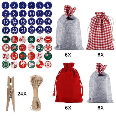 Setet består av 24 bomullspåsar, 24 träklämmor, 24 matchande siffermärken i filt och 10 meter rep för upphängning.