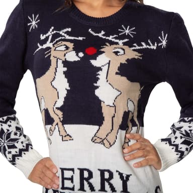 Jultröjan Merry Christmas är ett måste för alla romantiker under vintersäsongen. Motivet visar två renar som står vända mot varandra och mängder av frostblommor utgör medelpunkten mot en blå och vit bakgrund. Under står bokstäverna ""Merry Christmas"" med stora bokstäver. Den nedre änden pryds av typiska nordiska mönster. Detta mönster sträcker sig också till ärmarnas framsida. Den runda halsringningen och midjemudden på detta klassiskt designade plagg har en mjuk ribbstickning. Den fina dubbelstickningen ger hög bärkomfort och härlig värme, Material: 100 % akryl.
