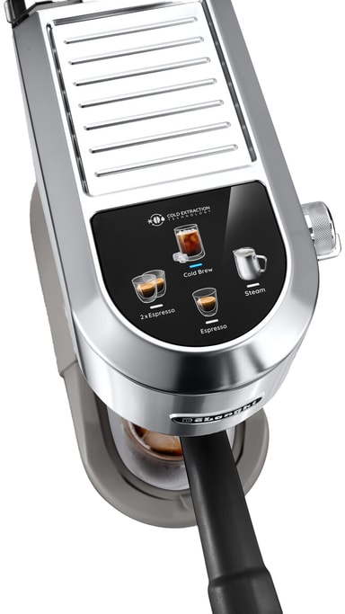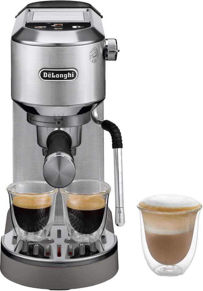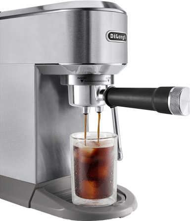 Brygga varma och kalla drycker med DeLonghi Dedica espressomaskin EC890.M. Denna manuella espressomaskin har en 1,1-liters vattentank och är utrustad med ett pekgränssnitt som låter dig välja mellan espresso, dubbel espresso och kallbrygg.Läs mer om produkten