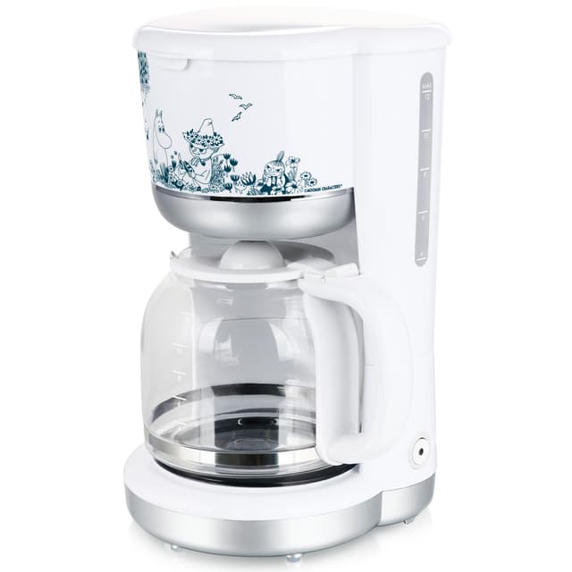 Denna effektiva och snygga kaffebryggare med mumin detaljer brygger snabbt 10 koppar kaffe.