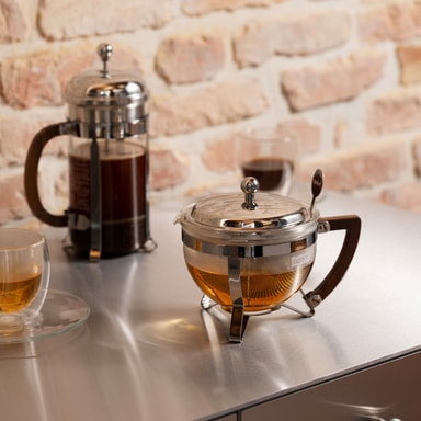 CHAMBORD glastekanna med infusionsbehållare är idealisk för användning med grönt, svart eller vitt te och med örtinfusioner. Den är infattad i en stilenlig ram av rostfritt stål, med ett ergonomiskt plasthandtag som underlättar upphällningen. Den kommer garanterat göra din te-ritual extra speciell.