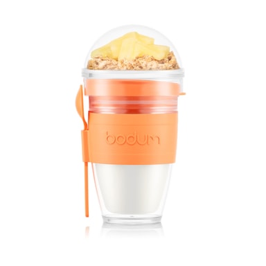 Den användbara mellanmålskoppen håller våta och torra ingredienser åtskilda tills du är redo att äta - aldrig mer fuktig granola eller grötig frukt! Håll din mjölk eller yoghurt färsk i den stora koppen med dubbla väggar, medan den smarta bubblan säkerställer att granola, frukt och andra pålägg förblir krispiga och härliga ovanpå. Innehållet hålls säkert med en silikontätning tills hungern slår till. Blanda sedan med clip-on-skeden och hugg in!