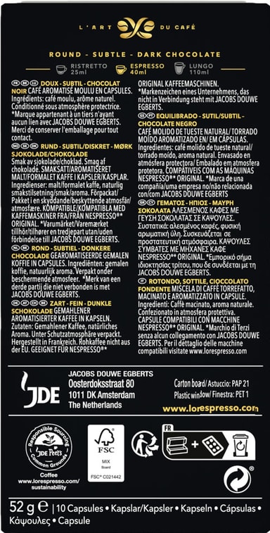Njut av den utsökta smaken av L'OR Espresso Chocolate kaffekapslar med en gnutta mörk choklad för en härligt söt kaffeupplevelse. Detta paket innehåller 10 återvinningsbara kaffekapslar som är kompatibla med Nespresso-maskiner.