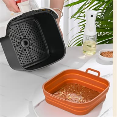 Fyrkantig form av livsmedelsgodkänt silikon. Den passar perfekt in i fritösen och förhindrar klibbiga och fastbrända matrester i din Air Fryer. Behållaren är återanvändbar och kan diskas i maskin. Den upphöjda kanten håller maten på plats och fångar upp smulor och överflödigt fett. Formen kan tryckas ihop så den tar mindre plats när den inte används.