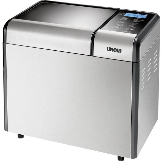 Brödbakmaskin Timerfunktion Unold Backmeister Top Edition Silver (matt)Effekt/spänning: 615 W, 230 V ~, 50 Hz Innnehåll: 750 till 1200 g brödvikt 11 sprarade program och 1 individuellt egenprogram Tidsvalknapp – förprogramerbar upp till 13 timmar