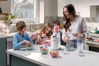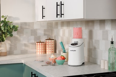 Nutribullet Chill glassmaskin NBD0503W förvandlar ingredienser till krämiga frysta godsaker på några minuter med fem förvalda program för glass, sorbet, gelato, smoothie bowls och fryst yoghurt. Enheten levereras med tre 500 ml muggar med lock, som kan användas både för ingrediensförberedelse och förvaring. Kompakt nog för förvaring på bänken och med diskmaskinsäkra delar för övre korgen.