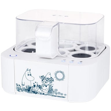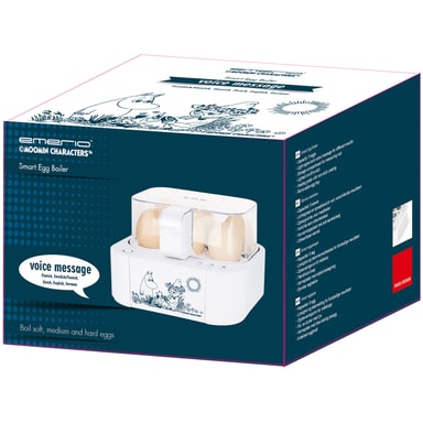 Äggkokaren är smart och minimalistiskt designad i vitt med snygg mumin-dekor, inbyggd måttbägare, ägg-pickare och förvaringsfack för 6 ägg. Med det valda språket, signalen och indikatorlampan kan nivåerna på äggens koktid tydligt följas.