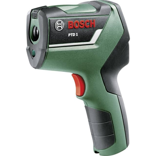 Bosch Home and Garden PTD1 IR-termometer Optik 10:1 -20 - +200 °C Pyrometer, DaggpunktsmätareLasercirkel med 12 laserpunkter · Infraröd sensor för yttemperatur · Integrerad raumtemperatur-/fuktighetssensor · Visning av temperatur, luftfuktighet och