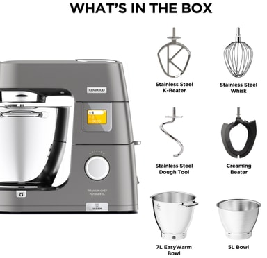 Kenwood Chef XL Titanium Patissier köksmaskin KWL90004SI är en mångsidig hjälpreda utrustad med en 7-liters EasyWarm-skål , en extra 5-liters skål, BakeAssist-pekskärm och en mängd olika förinställda SimpleTouch-program.Läs mer om produkten