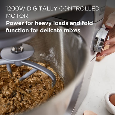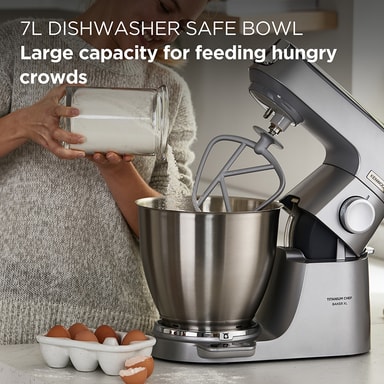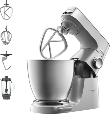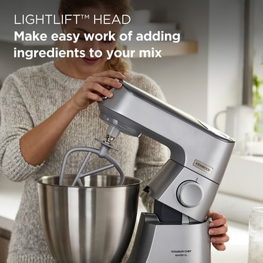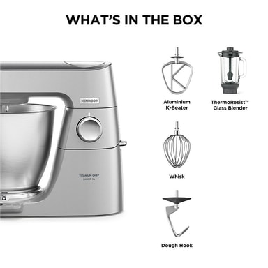 Kenwood Titanium Chef Baker XL är en kraftfull köksmaskin på 1200 W med en 7-liters skål, inbyggd EasyWeigh-våg och ThermoResist-mixer. Den ger exakt planetarisk blandning, stöder över 25 tillbehör och levereras med 10 års motorgaranti.Läs mer om produkten