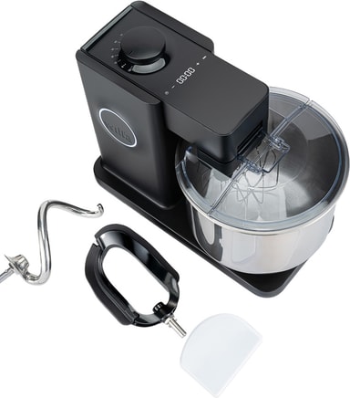 Den levereras med en degkrok för knådning, en flexivisp för blandning och skrapning, en dubbelvisp för att lufta blandningar, ett stänkskydd för att minska stök, och en degskrapa för enkel hantering och rengöring.